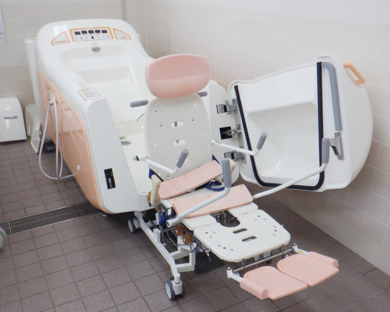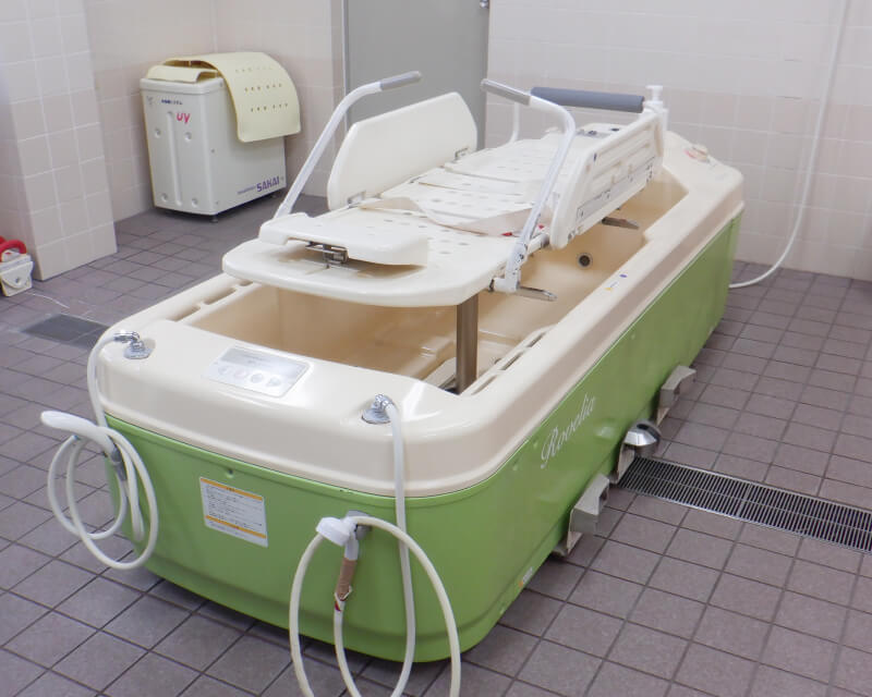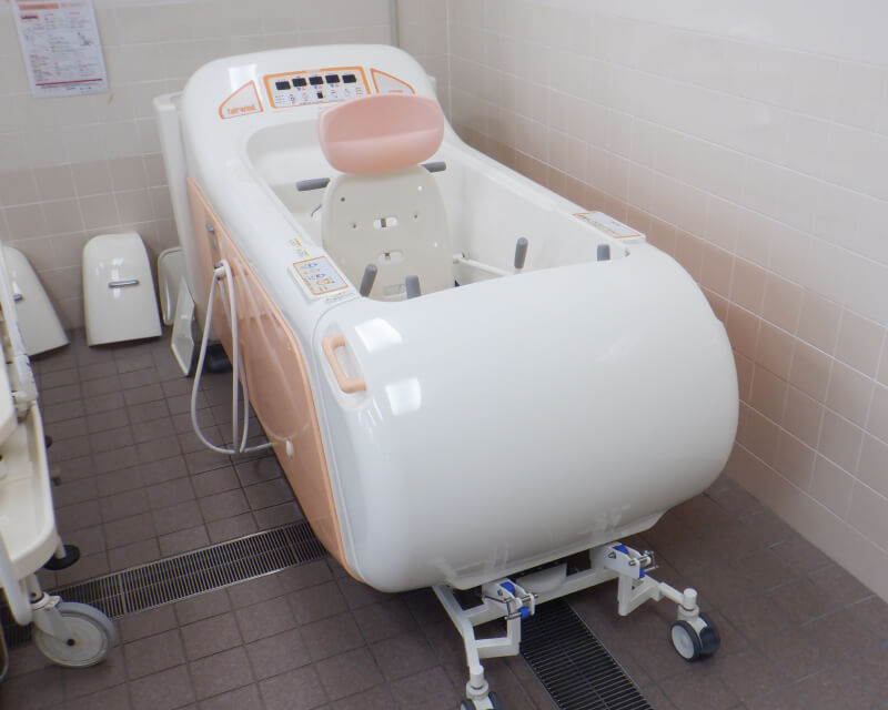 一般浴槽と特殊浴槽(ベッド型・イス型)をご用意しています。 職員2∼4名で安全に入浴していただけるよう見守り・介助をさせていただきます。